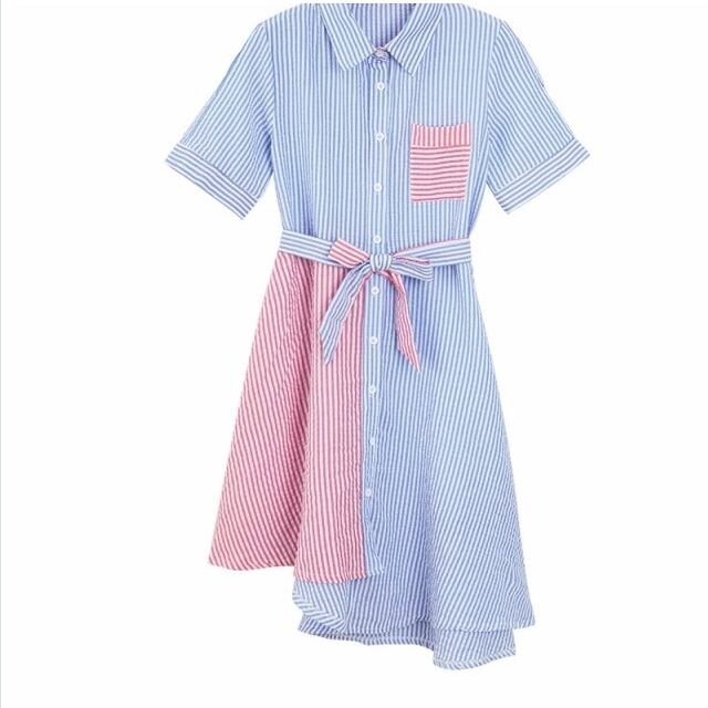 夏服 レディース レディース シャツ シャツワンピース ストライプ シャツ ワンピース おしゃれ アシンメトリー 半袖 膝丈 バイカラー 大