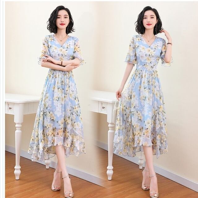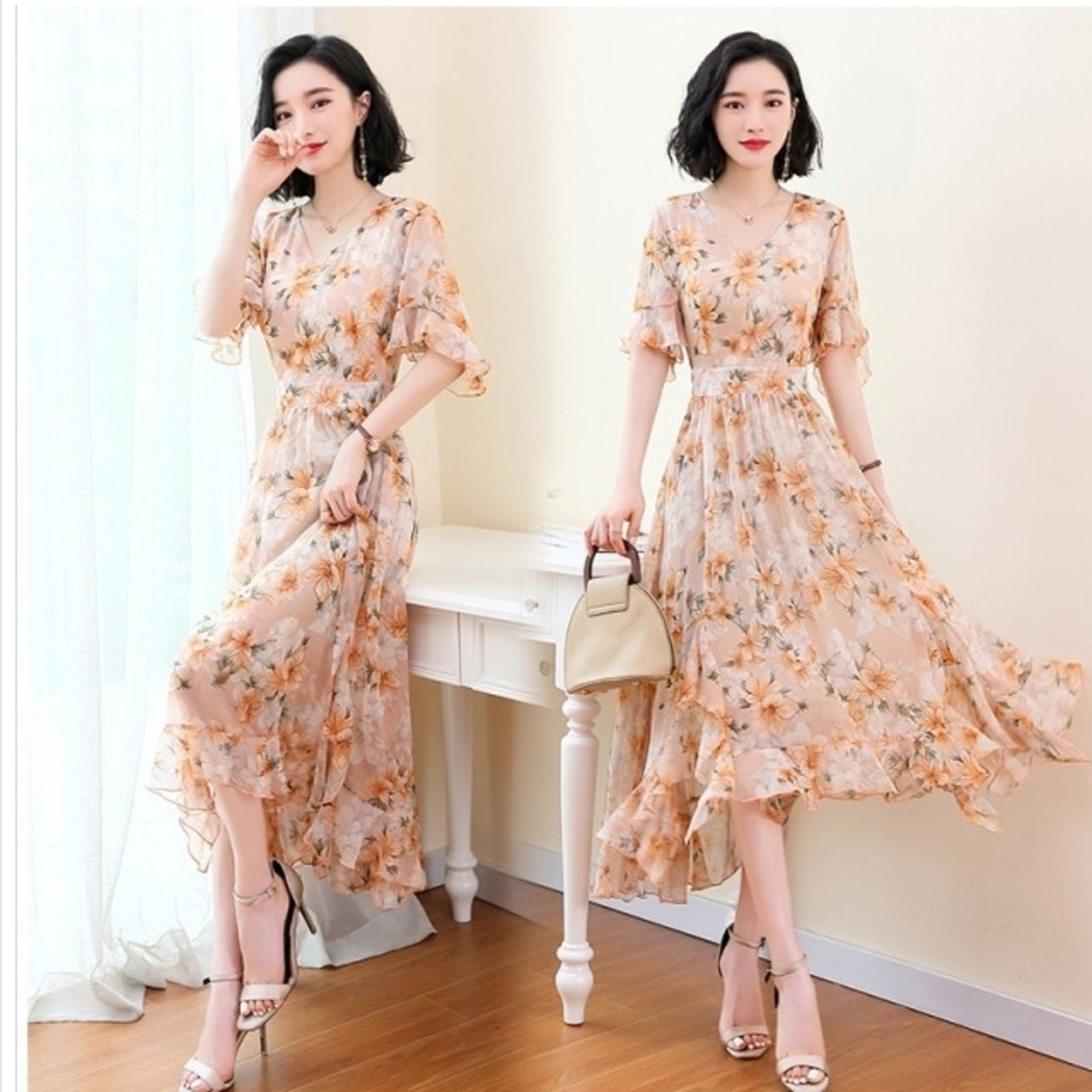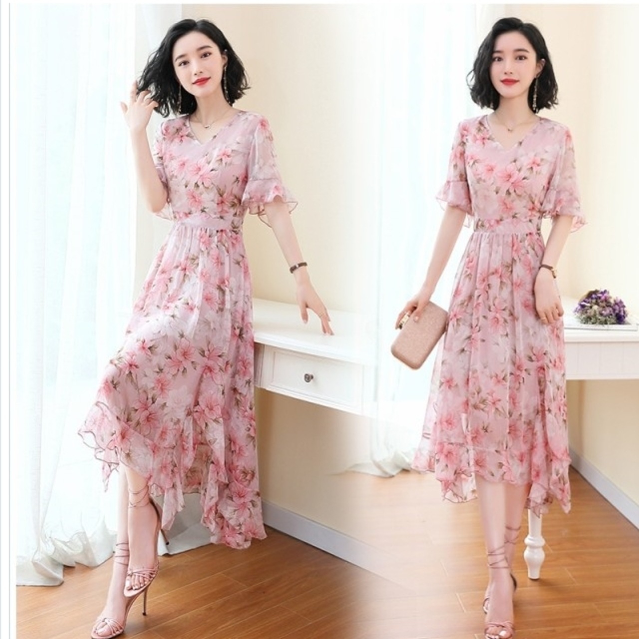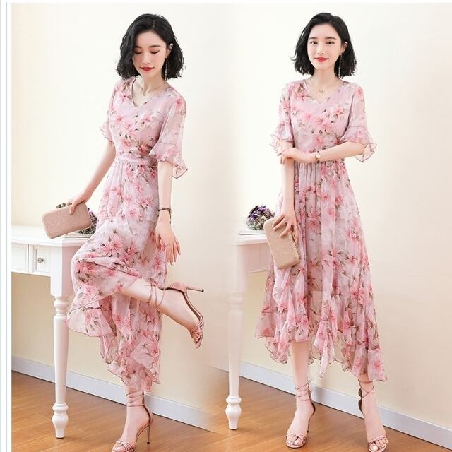 ワンピース 花柄 大きいサイズ レディース 小花柄ワンピース フレアワンピ シフォン ロング丈 3L 4L 5L ピンク 夏 ネコポス可