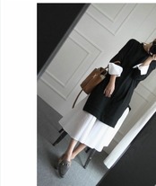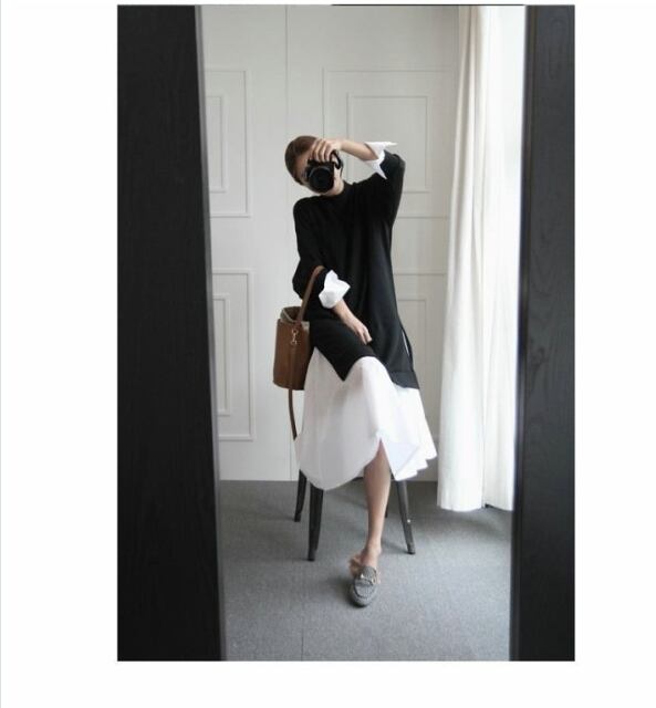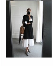 韓国 ワンピース 秋 大きいサイズ ホワイト ワンピース ロング 膝丈 ミモレ マキシ モード系 ストリート スカート フレア ブラ