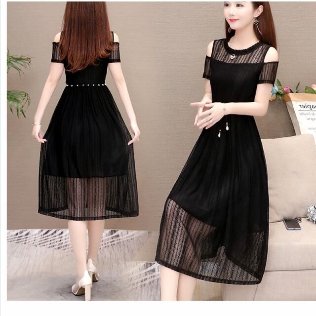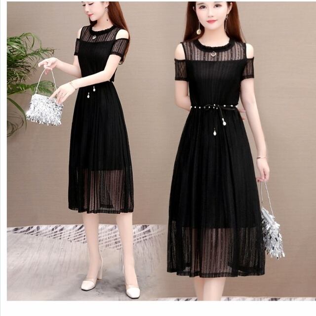 夏服 レディース 夏 ワンピース レース ロング丈 半袖 黒 無地 Aライン ウエストゴム オフショル ラウンドネック レディース オールイン