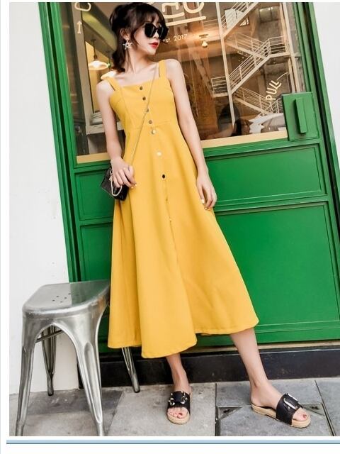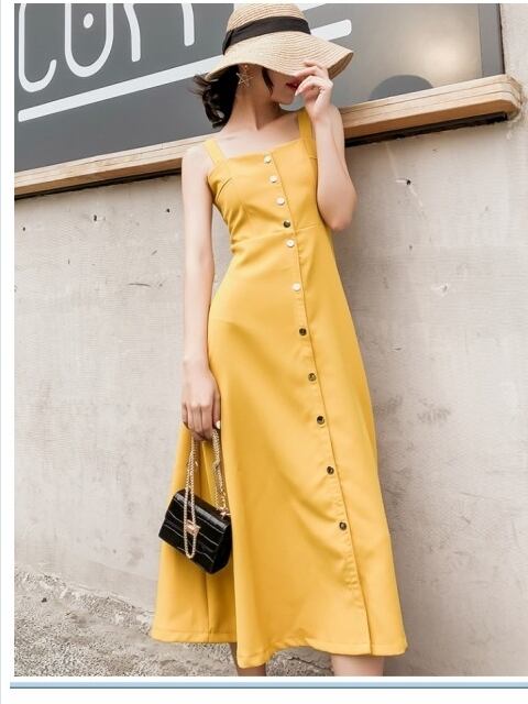 夏服 レディース ミモレ丈 ワンピース ノースリーブ ジャンパースカート フロントボタン イエロー 夏服 秋服 韓国 ファッション