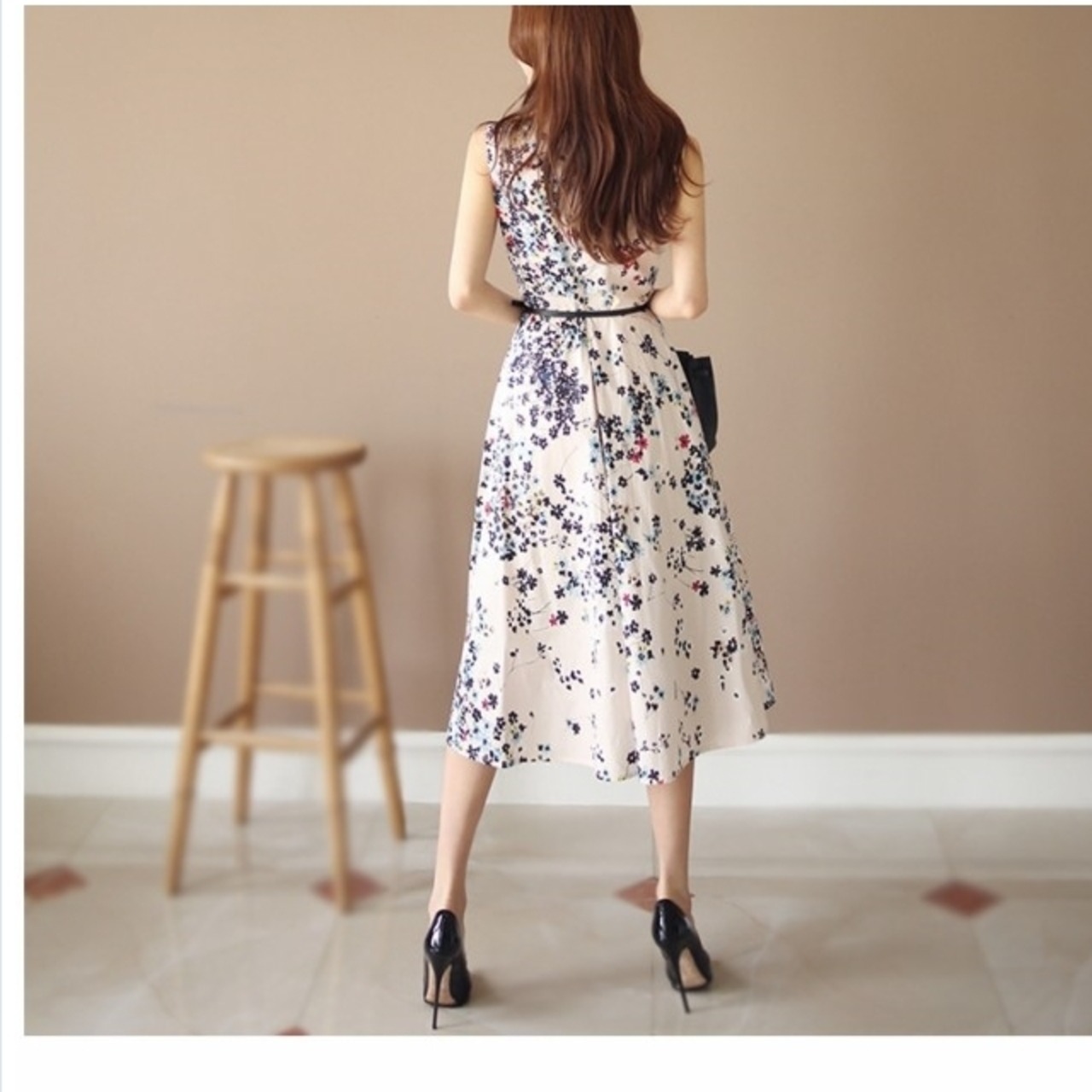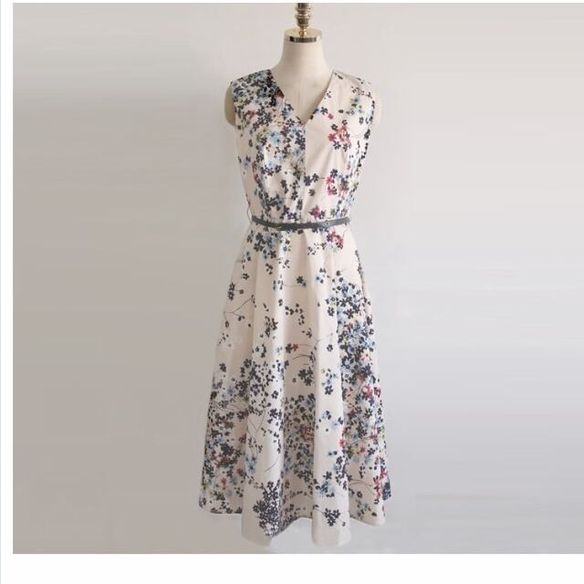 夏服 レディース ワンピース ワンピ レディース エレガント 花柄 プリントワンピース Vネック ノースリーブ ミモレ丈 ロングワンピ 大き