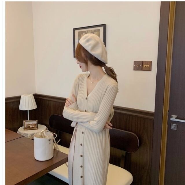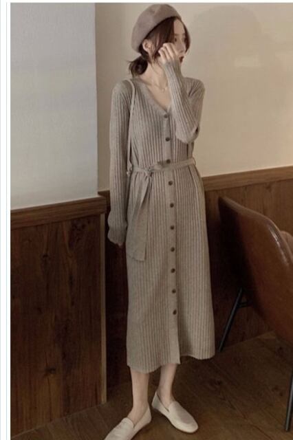 バックリボン ワンピース フロントボタン スムースリブニット Iラインワンピース≪ウエストリボンセット≫ 長袖 ゆったり シンプル カジ