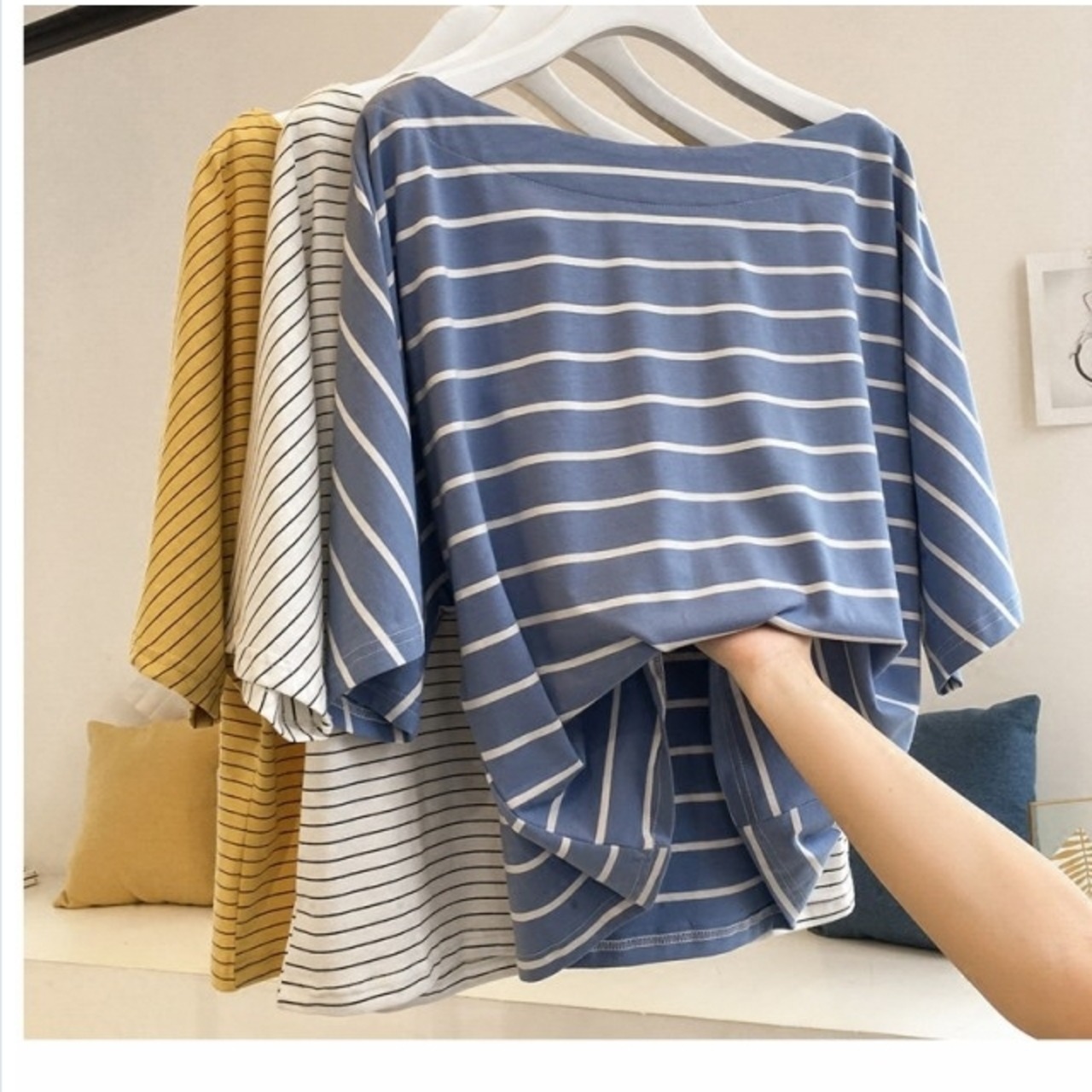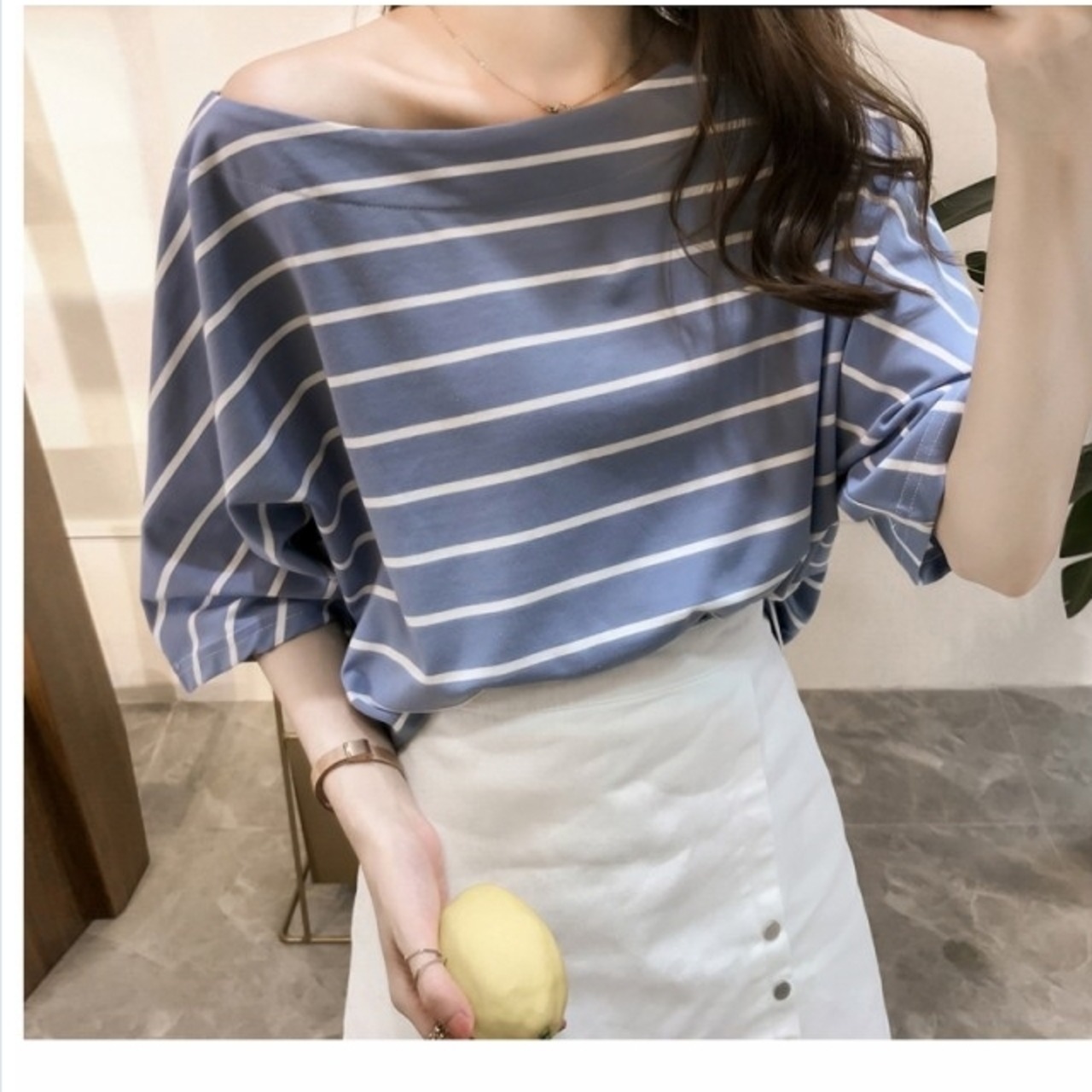 夏服 レディース ボーダー ボートネックカットソー プルオーバー ワイドスリーブ トップス レディース 韓国 オルチャン ファッション 春