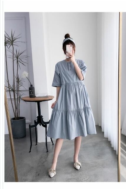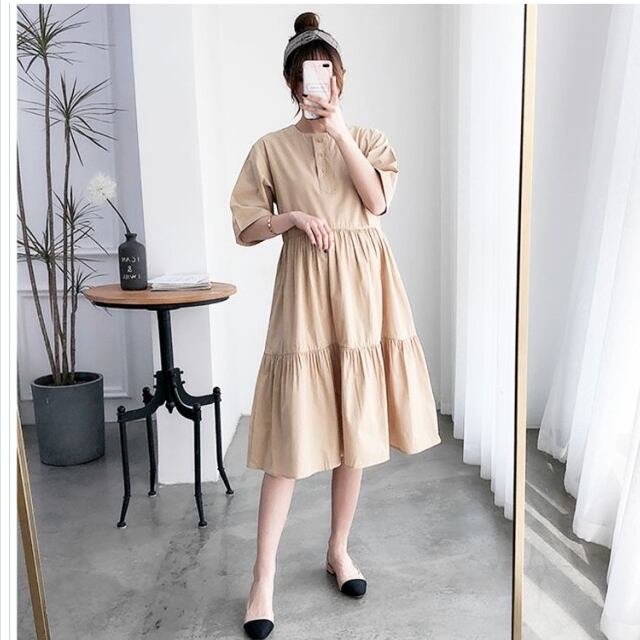フェミニン ワンピース ワンピース ティアード Aライン ロング丈 ハイウエスト スクエアネック 半袖 無地 シンプル 韓国 フェミニン