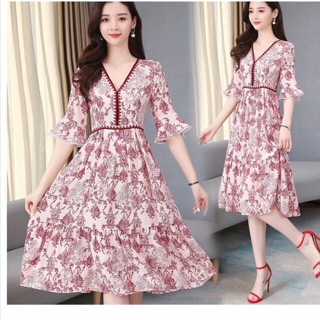 夏服 レディース シフォンワンピース 夏服 プリント 40代 Aラインワンピース 20代 レディース 夏ワンピース フレア袖 お洒落 膝丈ワンピ