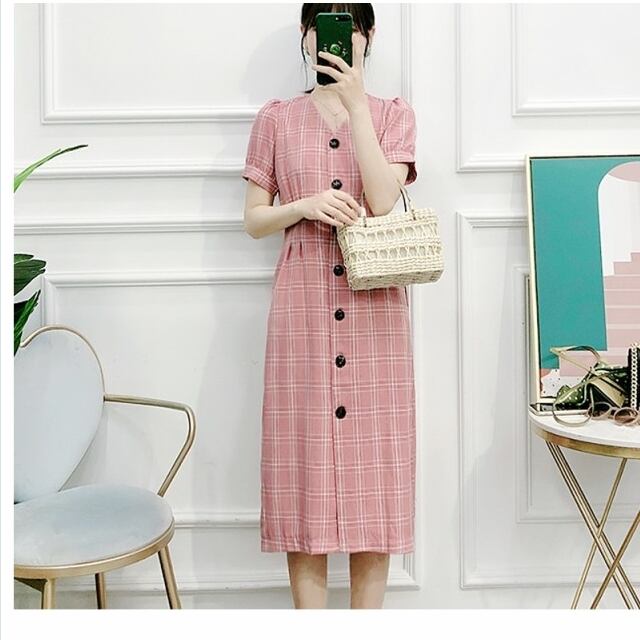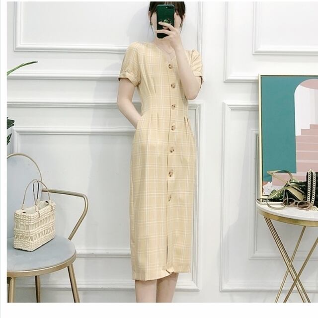 夏服 レディース チェック柄 ミモレ丈 ノーカラーシャツワンピース ロングワンピース チェックワンピース パフスリーブ 半袖 レディース
