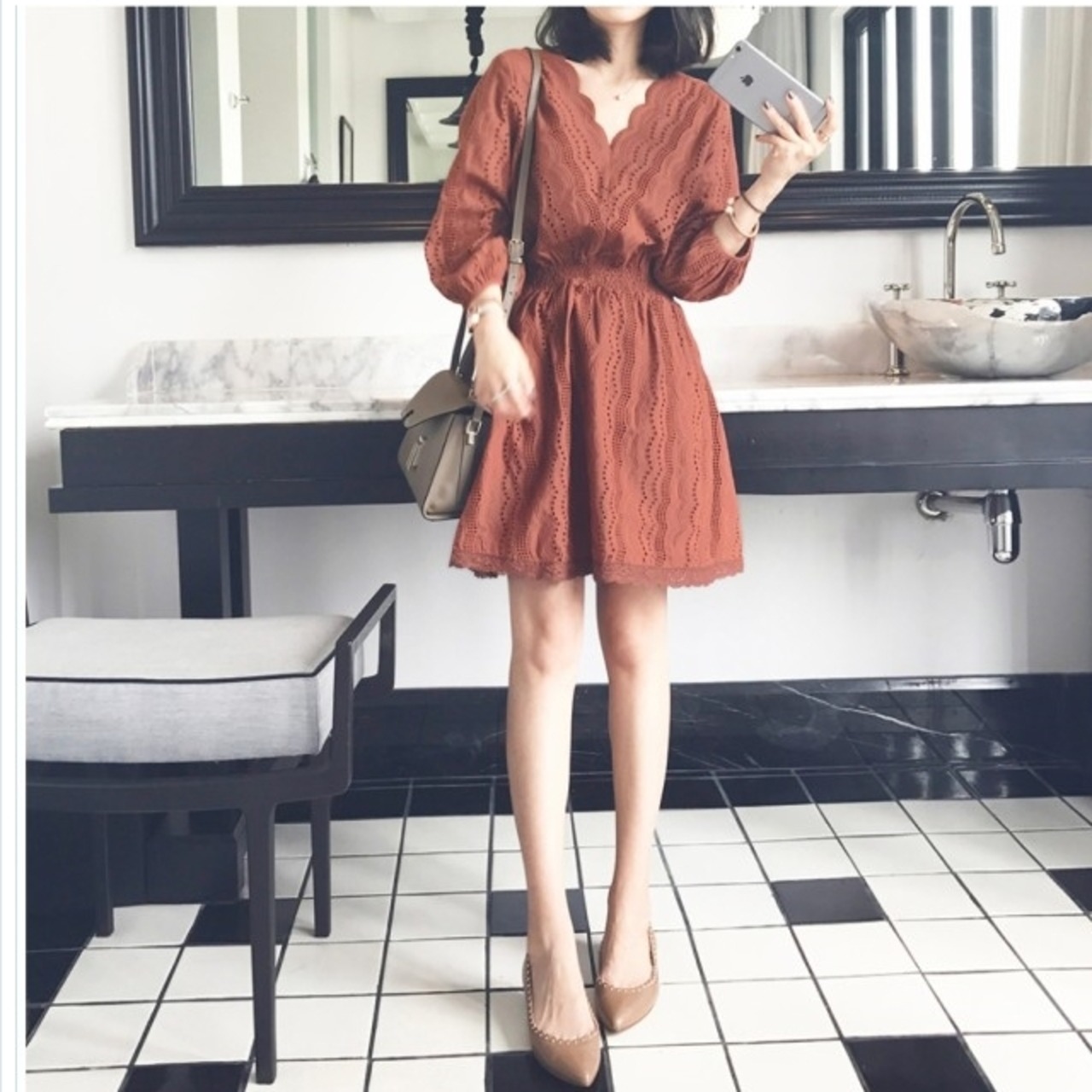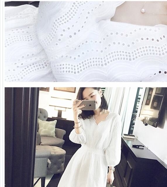 レディース 大きいサイズ 服 韓国 ワンピース コットンレース ランタンスリーブ レディース 膝上 Vネック スカラップ 大きいサイズ 夏新