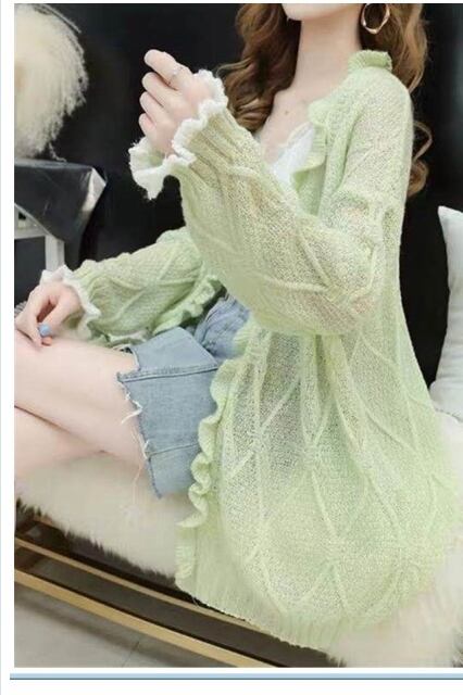夏服 レディース 薄手ニットカーディガン ロングカーディガン シアーカーディガン シアーニット バルーンスリーブ ボリューム袖 フリル