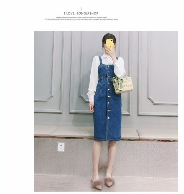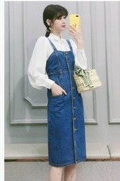 バックリボン ワンピース ジャンパースカート フロントボタン デニム ミディ丈 タイト ワンピース 20代