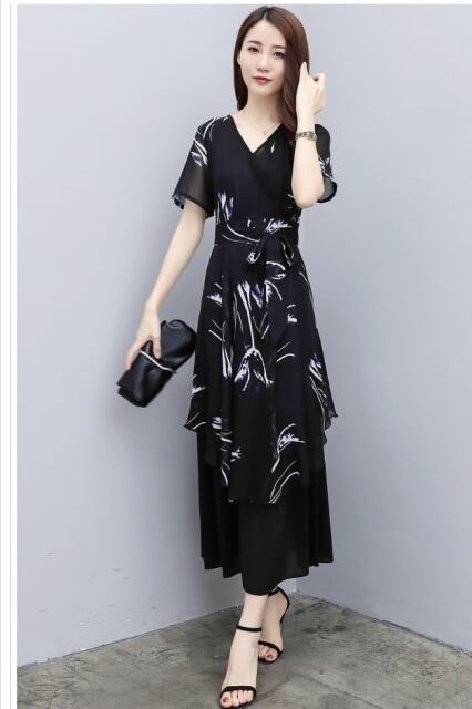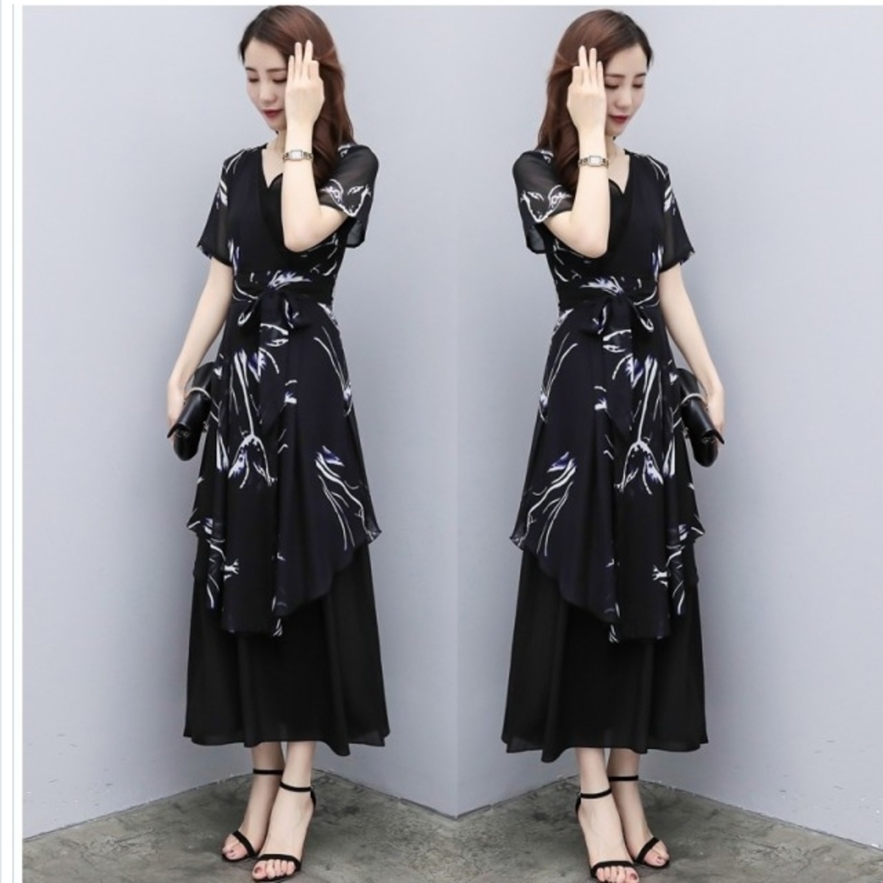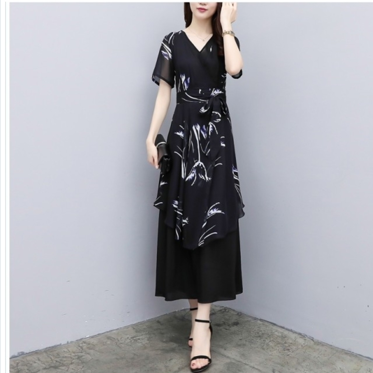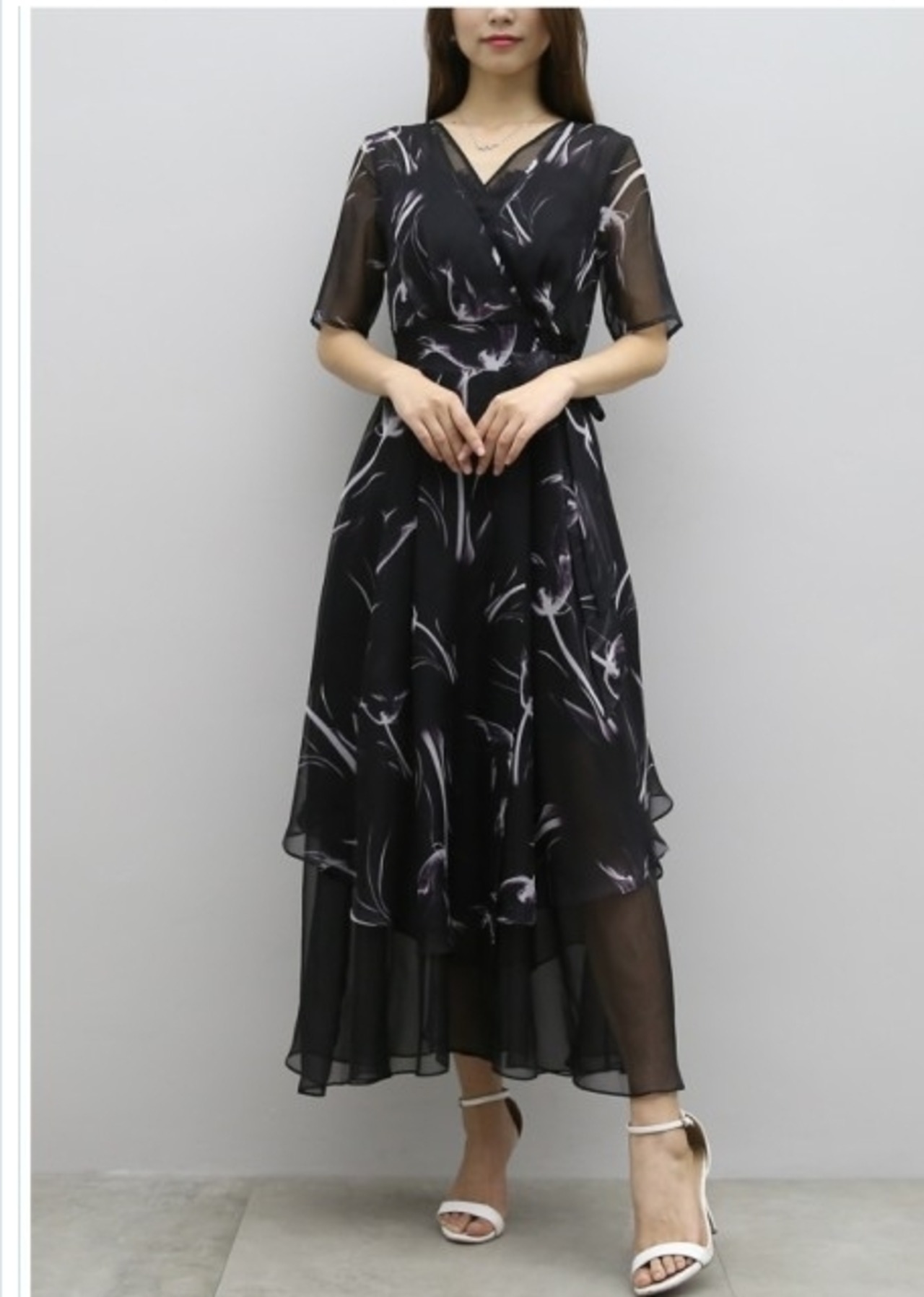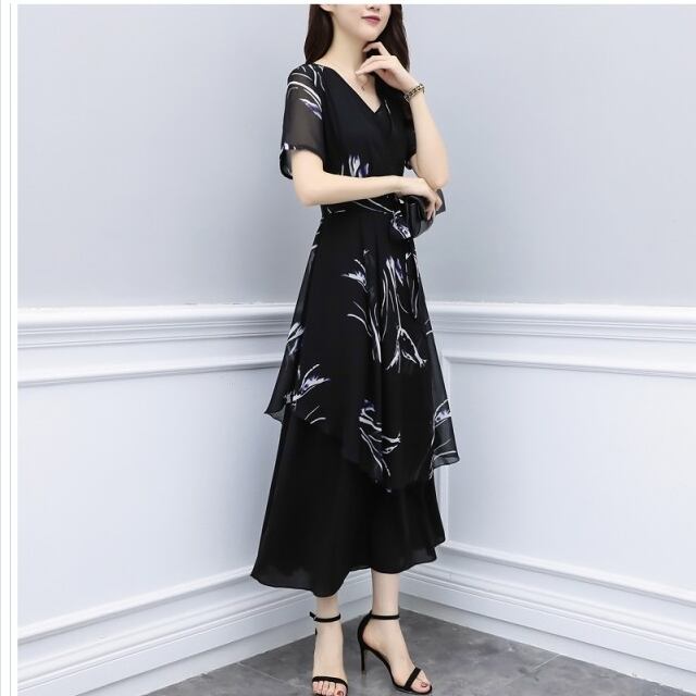 バックリボン ワンピース エレガント 花 ドット 黒 レーヨン バックボタン ウエストリボン 半袖 ワンピース
