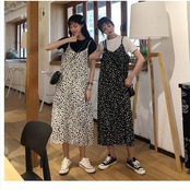 夏服 レディース ロングワンピース フェイクレイヤード レオパード キャミワンピース マキシワンピース 半袖 丸首 マキシ丈 膝下 ひざ下