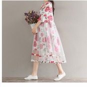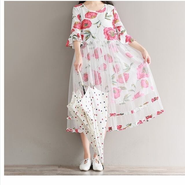 夏服 レディース 花柄 マキシ丈 シースルーワンピース ドッキングワンピース フレアワンピース ロングワンピース ワイドスリーブ レディ