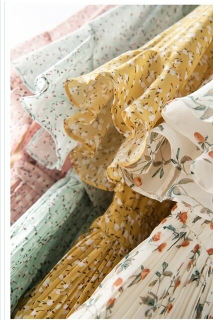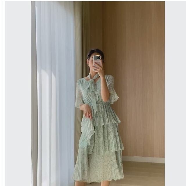 バックリボン ワンピース 韓国 オルチャン ワンピース ロング ミモレ丈 フレア袖 花柄 シフォン 透け ガーリー 夏秋