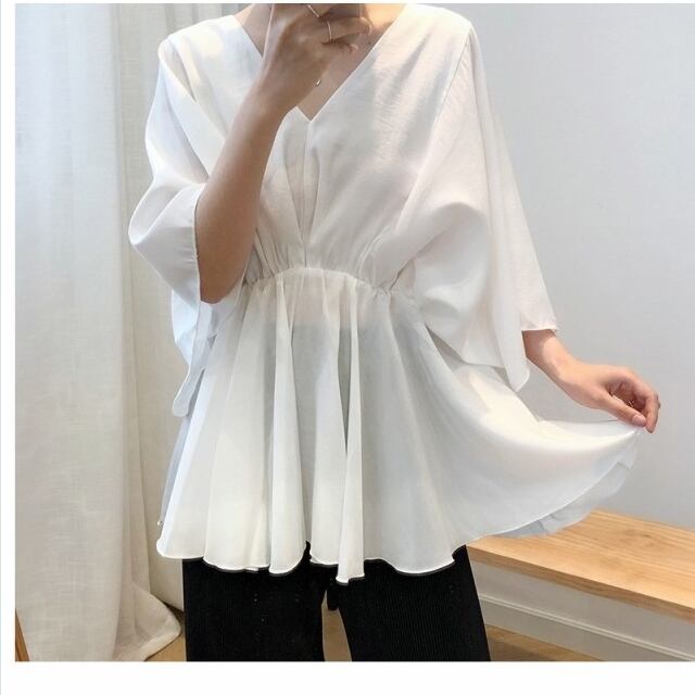 夏服 レディース シャツ ブラウス レディース トップス おしゃれ Vネック ドルマンスリーブ ギャザー シフォン プルオーバー 体型カバー
