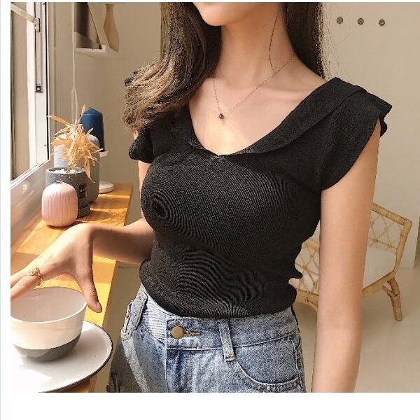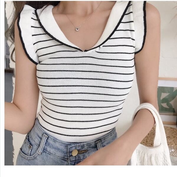 夏服 レディース 肩フリル ボーダー ニットキャミソール ノースリーブニットソー サマーニット スリーブレストップス レディース 韓国 オ
