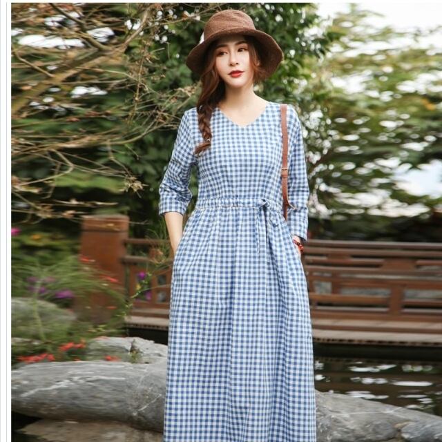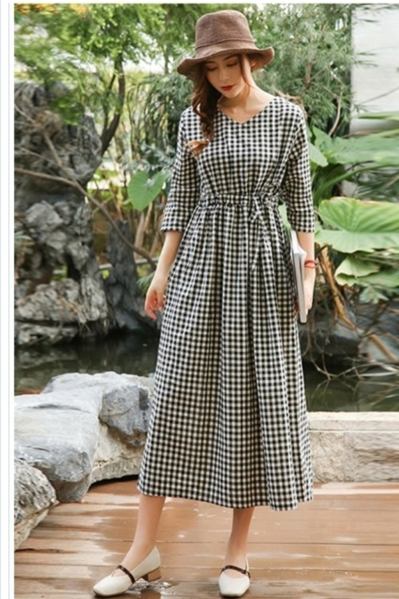 バックリボン ワンピース チェック柄 千鳥格子 ロングワンピース パフスリーブ バックVネック 半袖 レトロ セクシー フェミニン カジュア