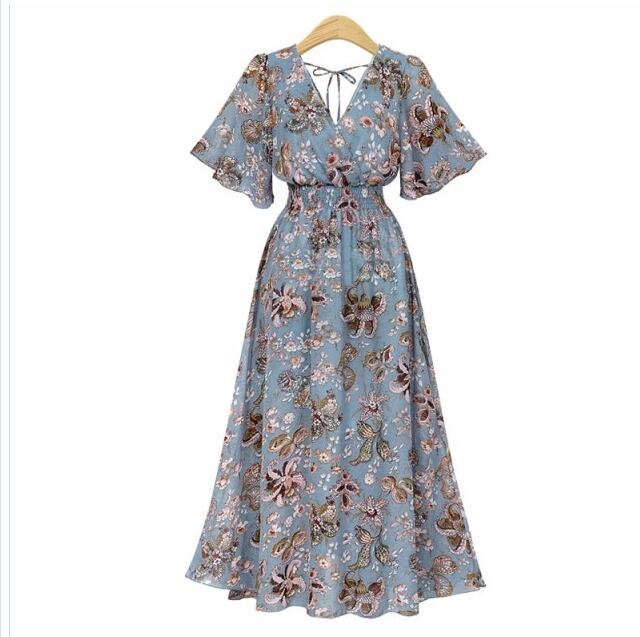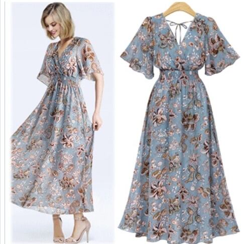 バックリボン ワンピース ワンピース レディース 花柄 伸縮性 花柄ワンピース フレア袖 かわいい シフォン プリント