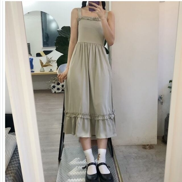 バックリボン ワンピース バックリボン ロングワンピース バカンス ノースリーブ 無地 カジュアル 裾フリル
