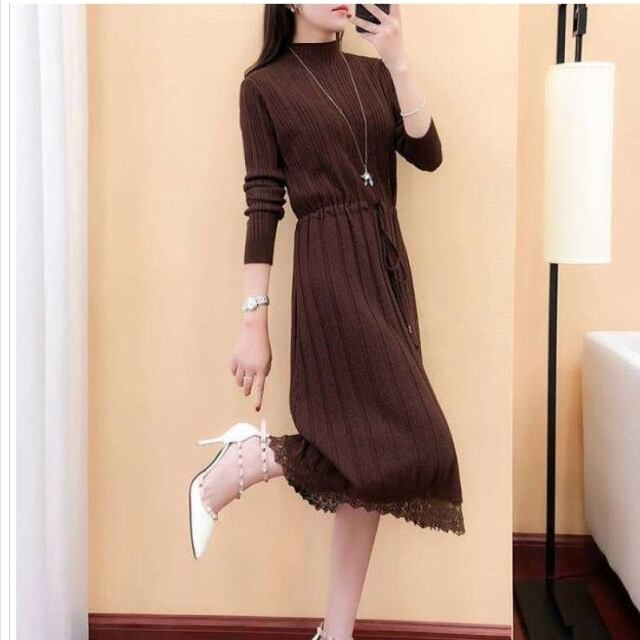 バックリボン ワンピース ワンピース レディース ニットワンピース 膝丈ワンピース セーター レース 半襟 ラウンドネック 長袖 リボン