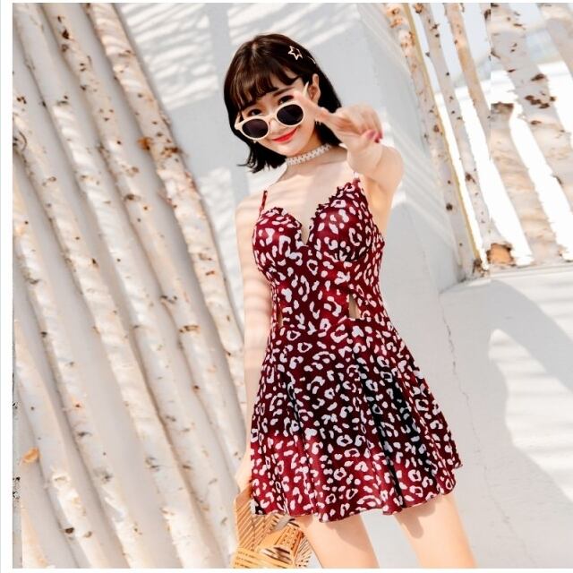 レトロ柄 ワンピース 水着 ワンピース ヒョウ柄 レオパード 細ストラップ 背中見せ レトロ セクシー