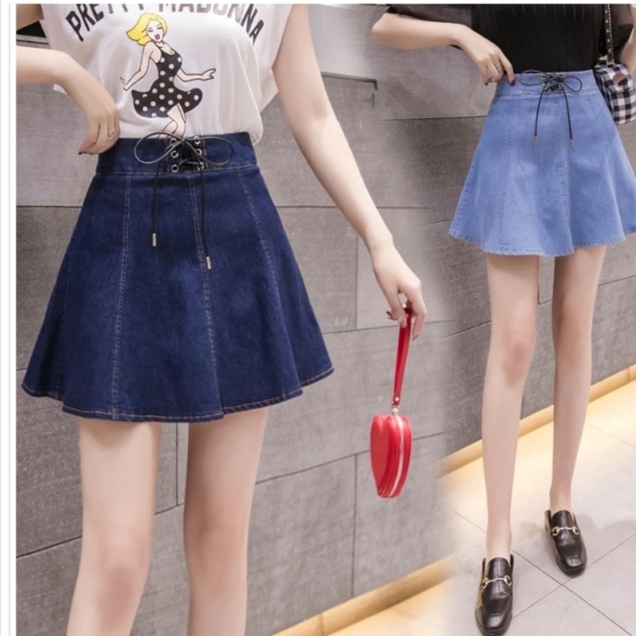 プリーツスカート ロング 花柄 デニムスカート ミニ 膝上 Aライン バックレースアップ リボン バイカラー フレイドヘム 無地 ブルー カジ