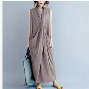 ワンピース 花柄 ロングワンピース レディース コットンリネン ノースリーブ 春夏 Vネック 前クロス ギャザー Aライン 体型カバー 無地
