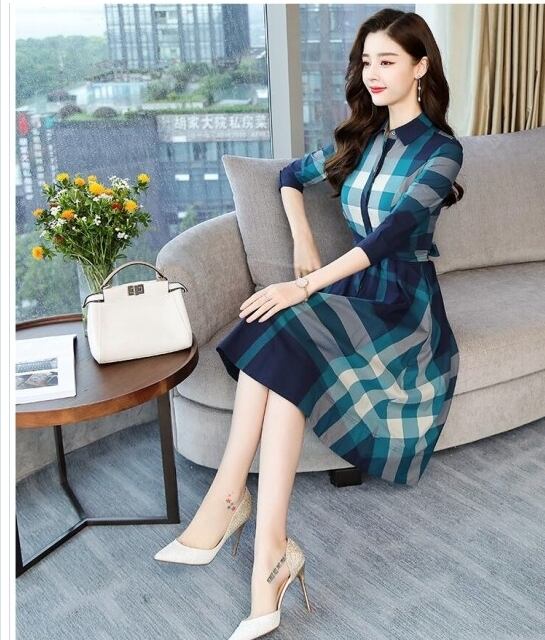バックリボン ワンピース ワンピース ブルー ひざ丈 チェック柄 フレア ハイウエスト パーティー お呼ばれ 20代 30代 40代 秋冬