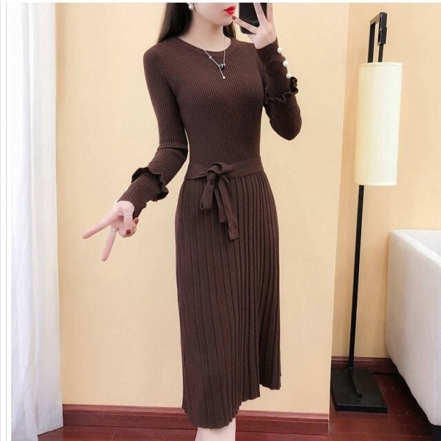 バックリボン ワンピース シーポンシック 大人ライン 袖コンシャス プリーツ ワンピース(ブラウン, フリー)