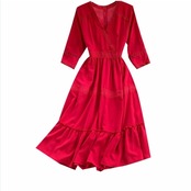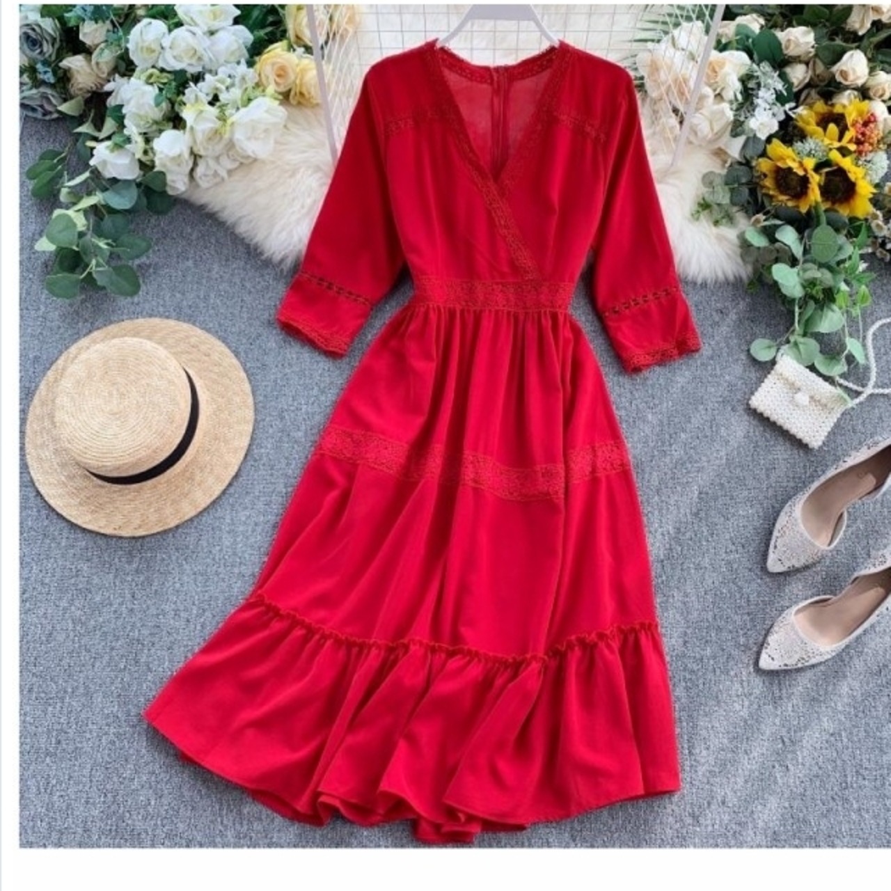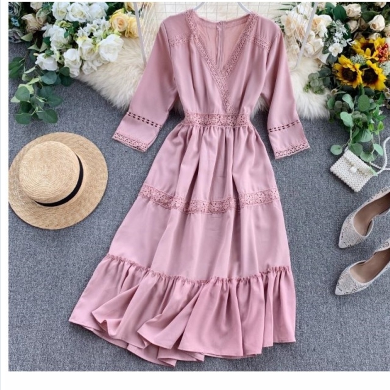 サマー ドレス マキシ レディース カシュクール ワンピース サマードレス ロング丈 長袖 レース 大人可愛い 体型カバー 売れ筋 シンプル