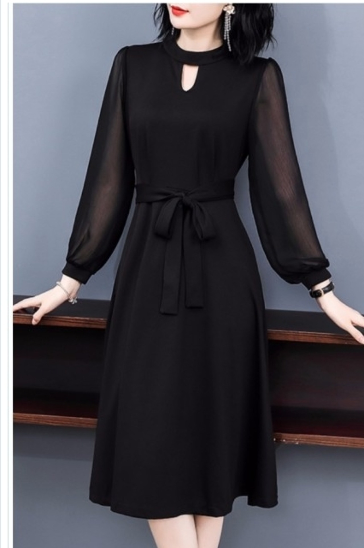 バックリボン ワンピース ワンピース フレア リングベルト ボートネック パフスリーブ 無地 黒 ブラック 大きいサイズ シンプル エレガン