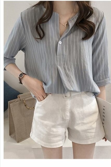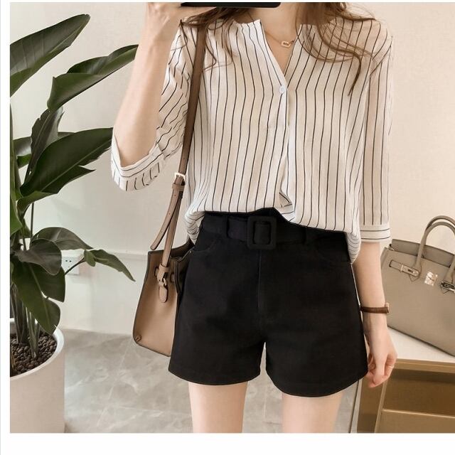 大きいサイズ トップス シフォン ブラウス レディース トップス シンプル 大きいサイズ 春 夏 秋 ストライプ スキッパー Vネックボタン