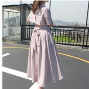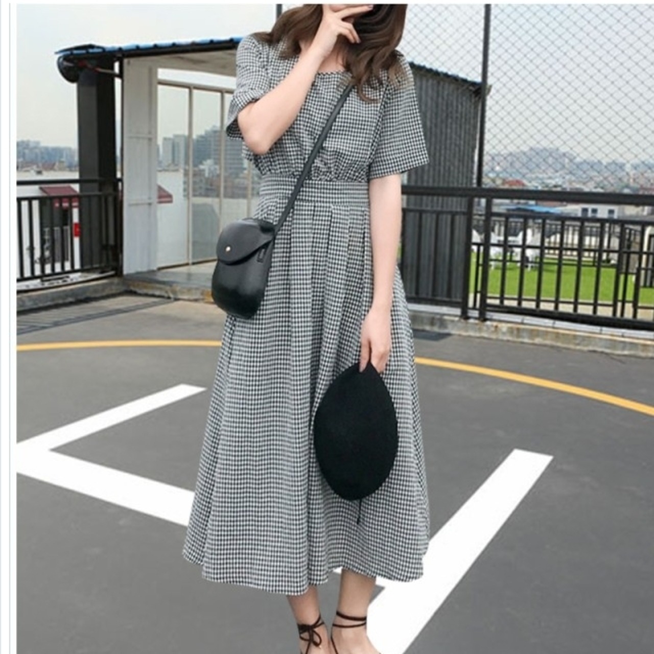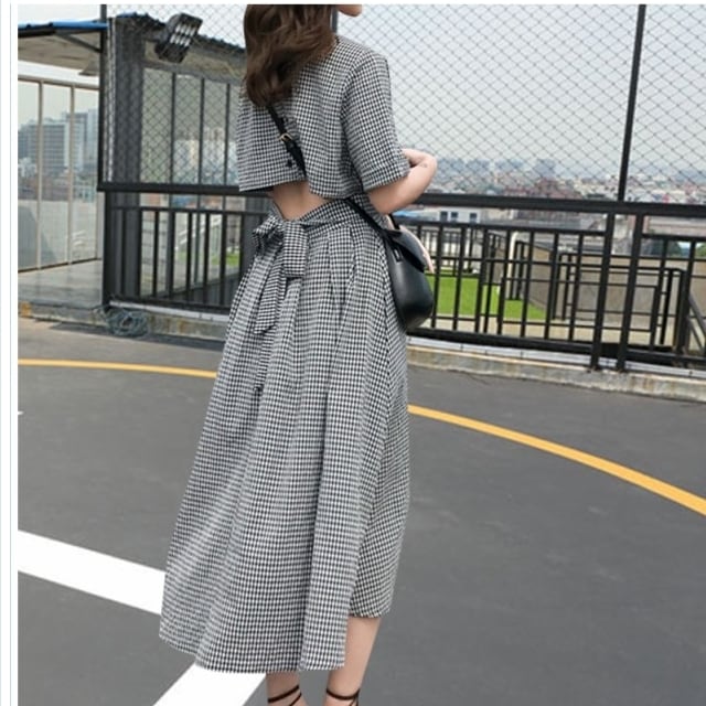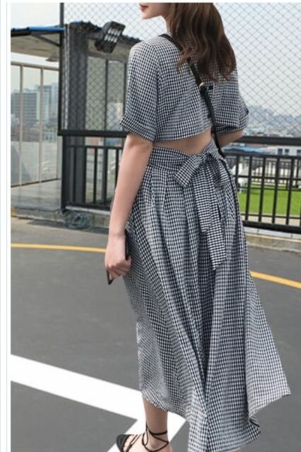 バックリボン ワンピース ワンピース チェック マキシ丈 半袖 腰見せ バックリボン Aライン レトロ 大人カジュアル お出かけ デイリー