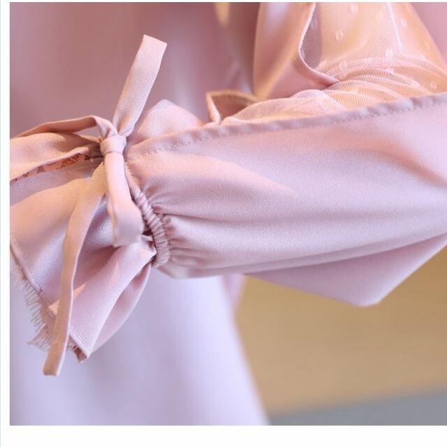 大きいサイズ トップス シフォン トップス シャツ ブラウス シフォン 長袖 キャンデースリーブ Vネック チョーカー ドット おしゃれ オフ