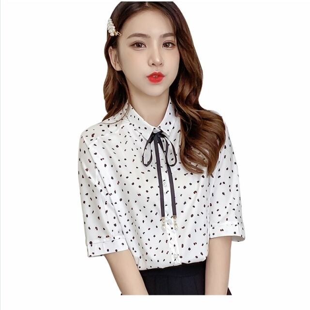 大きいサイズ トップス シフォン 秋新作 トップス ブラウス スタンダードカラー 半袖 ドット 水玉 大きいサイズ シフォン リボンタイ 大