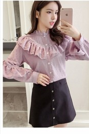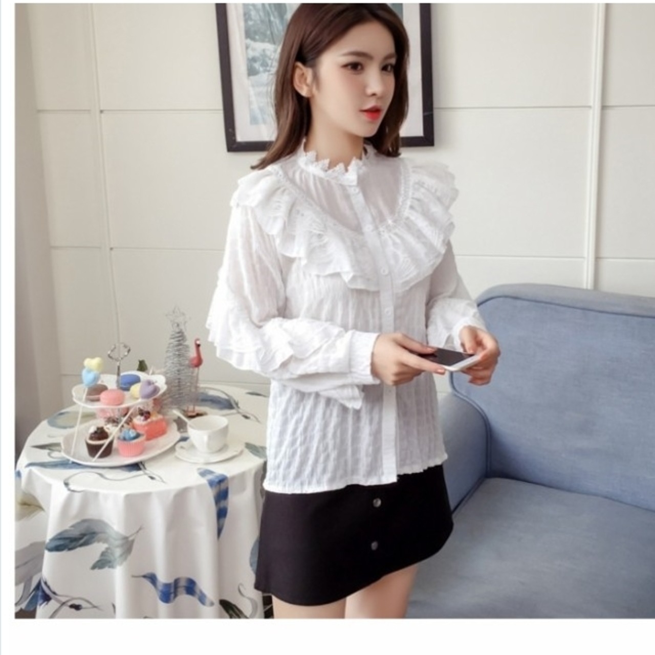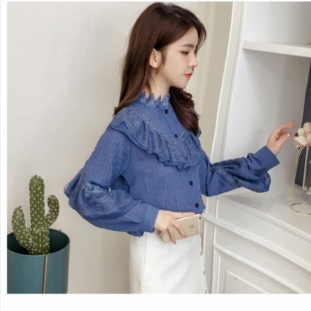 大きいサイズ トップス シフォン シャツ トップス 上着 シフォン ゆったり スウィート ピンク ホワイト ブルー 長袖 スタンドネック 大き