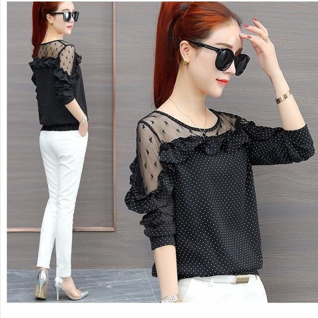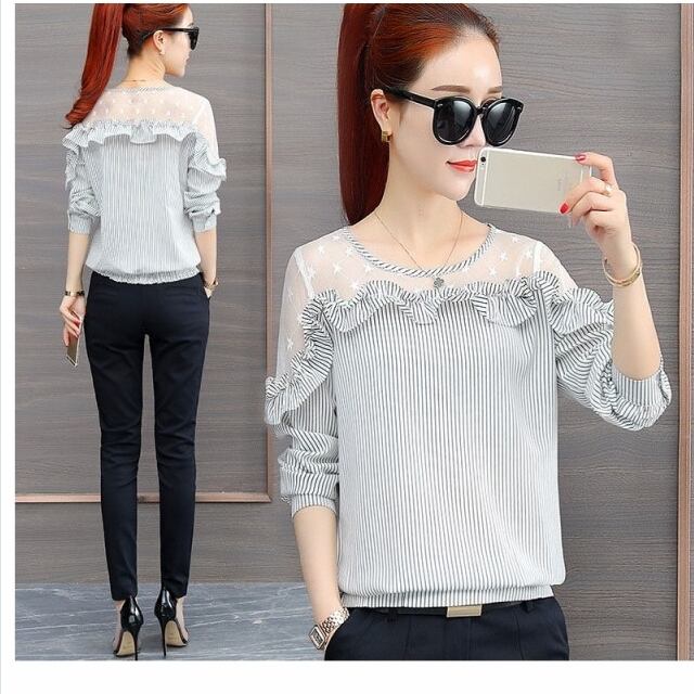 大きいサイズ トップス シフォン 大人ガーリー ブラウス シフォン レース ラウンドネック 長袖 大きいサイズ フリル ストライプ ドット