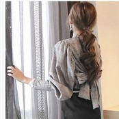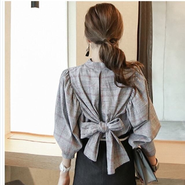 韓国 ファッション レディース 大きいサイズ シャツ レディース 大きいサイズ バックリボンハイネックタータンチェックシャツ 新作シャツ