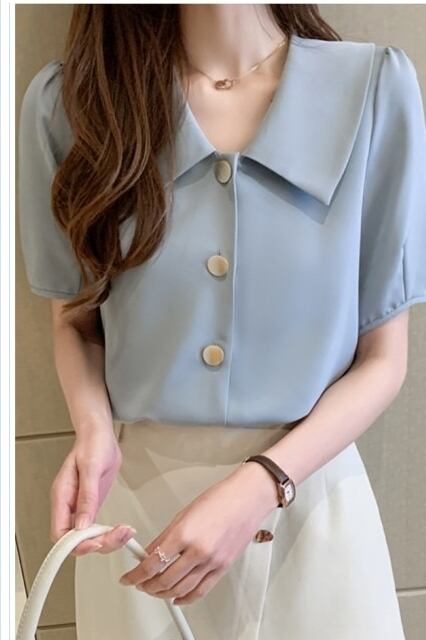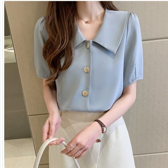韓国 ファッション レディース 大きいサイズ ブラウス レディース 40代 ブルー オシャレ フォーマル vネックシャツ きれいめ 韓国風 ブラ