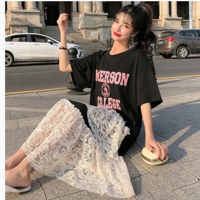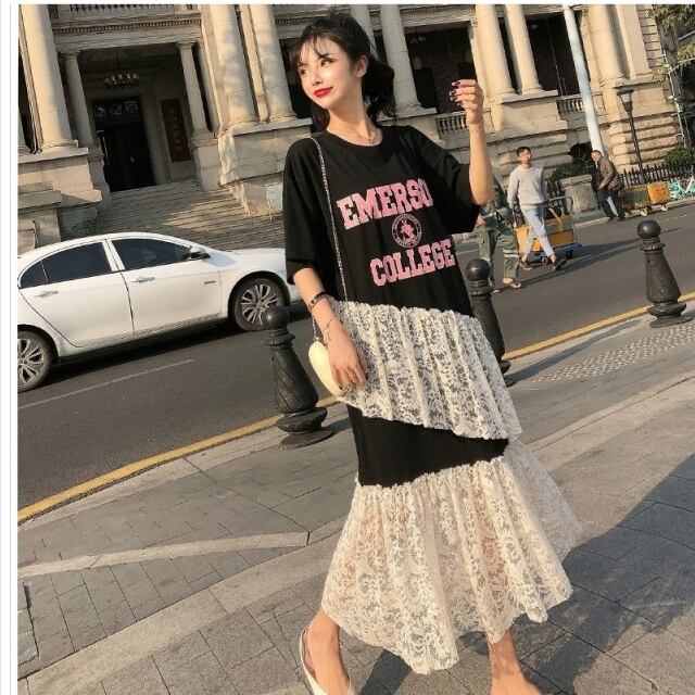 韓国 ファッション レディース 大きいサイズ 大きいサイズ レディース カレッジプリントTシャツワンピース レース切替 オーバーサイズ 韓