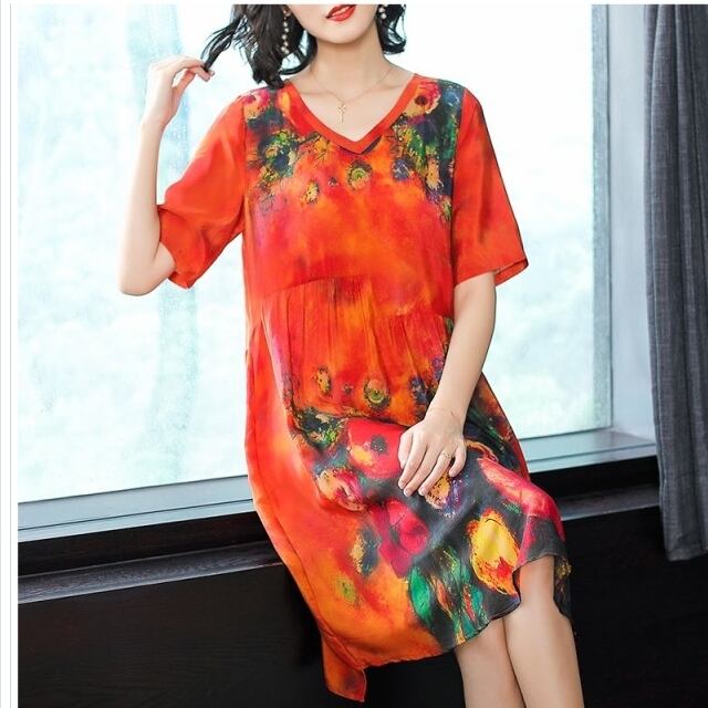 韓国 ファッション レディース 大きいサイズ 大きいサイズ レディース 総柄 Vネックワンピース 半袖 ロング 大人シンプル オーバーサイズ