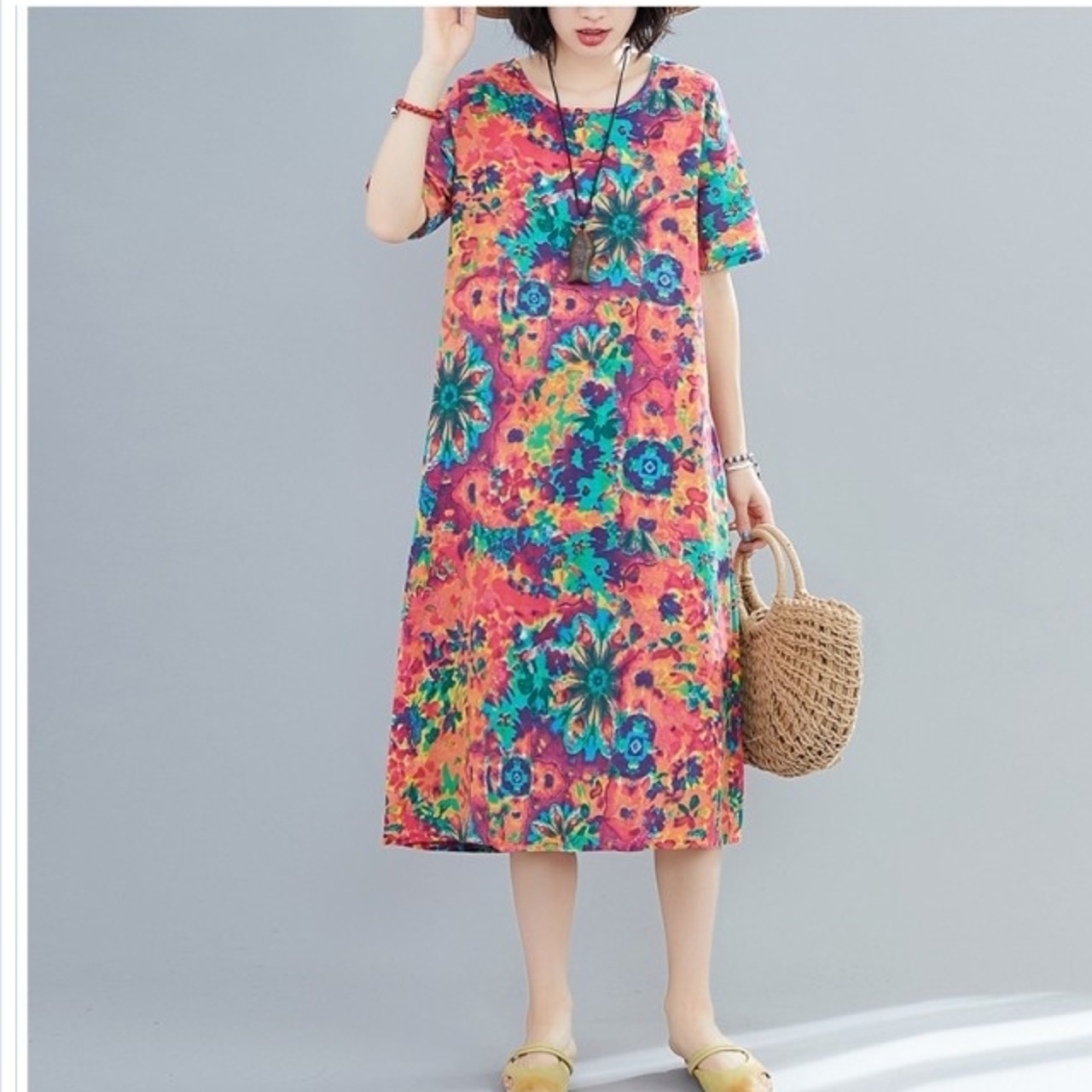 韓国 ファッション レディース 大きいサイズ 大きいサイズ レディース 花柄 総柄 ワンピース Vネック 半袖 ロング 大人 オーバーサイズ