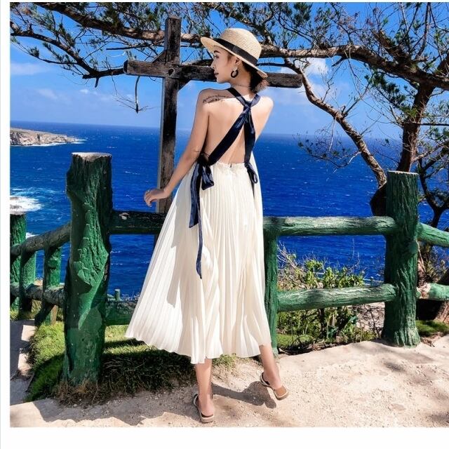 夏服 レディース バックリボン 背中開き 背中見せ ミモレ丈ノースリーブワンピース ロングワンピース プリーツワンピース リゾートドレス