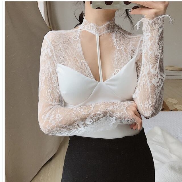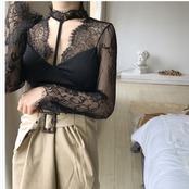 シースルー トップス 長袖 ビスチェ コルセット レース ハイネック カット コード 長袖カットソー 韓国 オルチャン ダンス 衣装 K シース