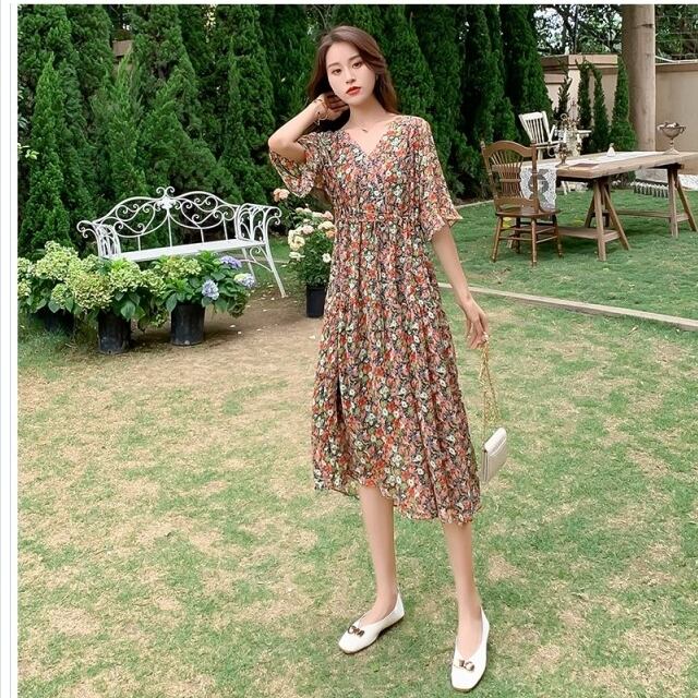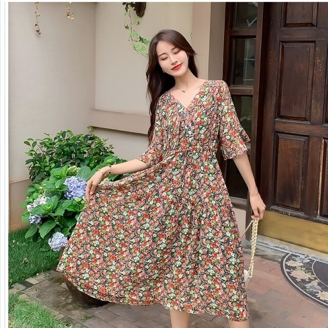 韓国 ファッション レディース 大きいサイズ 大きいサイズ レディース 小花柄シフォンワンピース フレアスリーブ オーバーサイズ 韓国フ