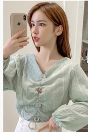ボリュームタック 秋新作 トップス シャツ ブラウス カットソー パフスリーブ バルーンスリーブ Vネック 金ボタン ギャザー 大人可愛い