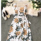 サマー ドレス リゾート サマードレス サマーワンピース 花柄 背中あき 肩フリル フロント スリット マキシワンピース マキシドレス ビー