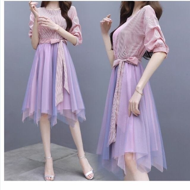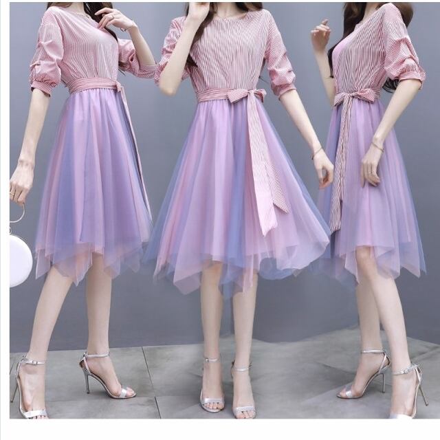 チュールスカート 大きい ワンピース チュール レース ストライプ ひざ丈 半袖 リボン 2ピース レトロ スーツ スカート 春 夏 大きいサイ