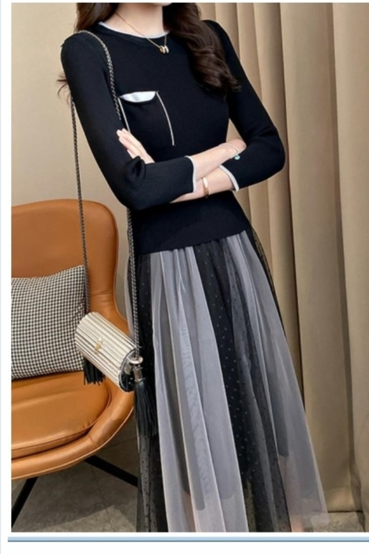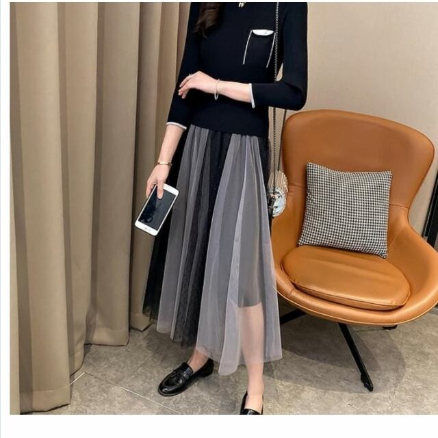 チュールスカート 大きい 結婚式 パーティードレス ぽっちゃり S-3L 大きいサイズ 袖あり 長袖 ニットトップス ドッキング ワンピース 黒
