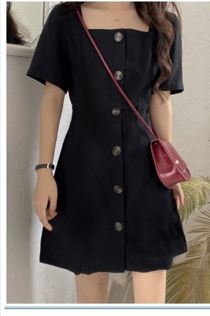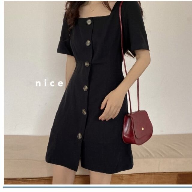 クラシカル ワンピース ワンピース スクエアネック 半袖 ミニ丈 無地 ブラック オルチャン 韓国ファッション プチプラ
